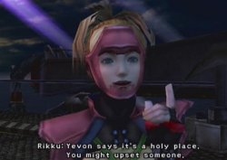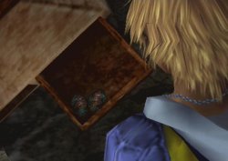 Rikku "Okay, leave it to me! I'll get you to Luca, promise!" "You'd rather stay here?" [Tidus says "Uh uh"] "Okay, I'll go tell the others. Wait here." [She begins to leave, then turns around] "Oh, and one thing." "Don't tell anyone you're from Zanarkand, okay?" "Yevon says it's a holy place. You might upset someone." [Tidus mutters "Oh...uh huh", and then leans on the railing. The screen goes black] "My Zanarkand, some kind of holy place? Yeah right, I thought." "Since when?" "Yevon? Sin? Luca?" "I thought Sin just took me to a faraway place, that I could go back in a day or two." "But a thousand years into the future?" "No way!" [Tidus kicks the crane area and falls; a loud rumble is heard, and the ship shakes. In the distance, something blasts out of the water. The door opens; people run onto the deck and fall down. Something in the water approaches the ship.] "Sin!" "Sin ec lusa!" ("Sin is come!") "Ihtan ic! Ihtan ic!" ("Under us! Under us!") [Tidus falls overboard and gets sucked into a whirlpool. The screen goes black]