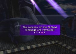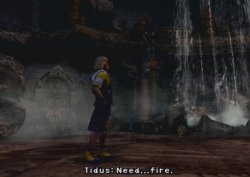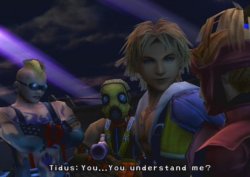 [He looks around, and sees an opening he can swim into. He begins to swim to the opening as quickly as possible, as the fish gains on him. The fish nearly has him entirely in its mouth as Tidus averts disaster. The scenes changes and Tidus, flung through the opening into another section of the building, lands safely into a thin layer of water. Several stones from above collapse and block the passage. He stands up] "I had made it out of the frying pan...and into the freezer." "I thought I was going to die in this place." [He enters another section of the building. It's huge, and entirely empty. He looks around] Tidus "Cold... "Need...fire." [Tidus looks around. He finds somewhere he can make a fire: "The remains of a campfire. With flint and tinder, you could start another fire here." He finds the necessary flint and tinder and the fire is made. He warms his hands above the fire, and then lies down, looking up at the high dome ceiling] Tidus "I need food!" [Screen goes white; a flashback occurs] Tidus "What do you want?" Auron "It was a bad call." "Your team lost because of you." Tidus "You came to say THAT?" Auron "It's been...ten years." "I thought you'd be crying." Tidus "Who, me?" [The mysterious short person from Zanarkand comes on screen] "You cried." [Flashback ends; returns to the present. Tidus is sitting down as the fire withers and dies. The camera angles up to show something running along the wall of the Ruins. Tidus, falling asleep, quickly wakes up and looks around. He looks at the dying fire] Tidus "Hey, wait! Wait! Don't go out on me!" "Just hold on. I'll get more wood!" [Tidus looks around; he sees the big bug on the wall. The large insect runs around the walls, and then jumps down, face to face with Tidus. Battle begins: Tidus vs. Klikk. Partway through the battle, one of the ruins' doors blasts open. A group of people walk through, holding guns, led by a strangely-dressed girl with goggles. The fight continues; her, known as "????", and Tidus, vs. Klikk] Tidus "You on my side? Cool!" [The creature eventually dies. Tidus comes face to face with the strangely-dressed girl. She lifts her visor/goggles. Tidus stares with his mouth open for a moment, before breathing a sigh of relief] Tidus "Whew! That was close." [Someone walks up behind Tidus and grabs his hair] "Hey, lemme go!" [Several more people surround Tidus and point guns at him] "Fryd ec drec?" ("What is this?") "Y fiend! Eh risyh teckieca!" ("A fiend! In human disguise!") "Oac! Ed ec cu!" ("Yes! It is so!") [One of them pulls a knife and holds it in front of Tidus' throat] "Fa gemm ed?" ("We kill it?") [The girl speaks up] "Fyed!" "Fryd ev ed ec risyh?" ("Wait!") ("What if it is human?") [The person with the knife points it at the girl] "Drao yna dra cysa eh taydr." ("They are the same in death.") [The girl speaks again] "E vunpet ed! Fa pnehk ed fedr ic!" ("I forbid it! We bring it with us!") [She walks up to Tidus] "Cunno." ("Sorry.") [She knees Tidus in the stomach. He falls unconscious] [Scene changes. A large boat is floating on an ocean which spans as far as the eye can see. Tidus wakes up. He's surrounded by the people from earlier. One of them turns around and sees he woke up] "Ced, lybdeja!" ("Sit, captive!") [He hits Tidus, who falls back] Tidus "Hey, that hurts!" "Hu sujehk, rayn?" ("No moving, hear?") Tidus "Whoa... Okay." [Two more people approach him. The girl from earlier, and a guy with a blonde mohawk] "Caynlr res!" ("Search him!") [He begins to do alot of actions with his arms to signify swimming, all the while grunting] Tidus "Right. Whatever." "Tu oui hud cbayg?" ("Do you not speak?") [He shows Tidus a necklace of some sort and points to it, grunting once more] Tidus "I said I don't understand!" "Ehcumahla!" ("Insolence!") [One of the Al Bhed points his gun at Tidus' chest. The girl speaks up again] "Fyed!" ("Wait!") "He said you can stay if you make yourself useful."