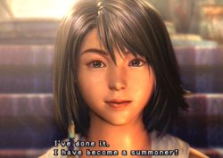 "I've done it. I have become a summoner!" [Scene change; back in the first room of the temple, several people surround the summoner and her guardians] "Man, was I surprised." And here I was thinking summoners were all old geezers." [Tidus runs out of the temple] Wakka "Hey, over here!" [Wakka takes hold of Tidus and drags him towards a circle that the summoner and her female guardian are standing in. They join a group of people standing around the circle. The guardian steps out of the circle and joins them] Tidus "What? Ow!" Wakka "Wait till you see this!" Tidus "I can't see anything!" Wakka "Ready!" "Okay." [The summoner performs a series of motions and gestures. The aeon is summoned; a large multi-coloured bird-like creature. It descends; the summoner strokes its neck. Everyone is pleased. Wakka and the female guardian enter the circle to congratulate the summoner] "I had never seen anything like it in my life." "Sure, it was a little scary, but still..." "I could feel a strange kind of gentleness coming from it." [You get to name the summon. Default name: Valefor] "I remember..." "That night, we talked for the first time." "I didn't know it then, but after that night, everything changed." "For everyone... For me..." [Scene change; it's nighttime. Tidus and Wakka are standing in front of the rest of the Besaid Aurochs] Wakka "Let me introduce you to the team." "This guy here wants into the tournament so bad, I let him on the team." "His memory's a little fuzzy, so don't mind him if he says anything odd!" "Come on, say hi." [Tidus steps forward, and scratches the back of his head. All is silent for a few moments] Tidus "Uh... Hi, guys." "So, what's our goal?" Aurochs "To do our best!" Wakka "Nope, we got a new goal now!" "Our new goal...is victory!" "To win every match, defeat every opposing team!" "To bring the Crystal Cup back to our island!" "That's all we need to do to win! Easy, ya?" "Victory..." [The Aurochs repeatedly say, and eventually yell, "Victory" over and over. Tidus looks over at the summoner, who's sitting down talking with a few of the townspeople] Aurochs "Victory! Victory! Victory!" [Tidus walks over to the summoner. Three people; an old man, and old woman, and a kid, each have pleasant things to say to Tidus in succession] "You heathen!" "Stay away from the summoner!" "You're a bad man!" [The summoner stands up] "Lady Yuna! Be careful!" [The summoner replies] "But it was really my fault to begin with." [She walks over to Tidus] "I'm Yuna." Yuna "Thank you so much for your help earlier." Tidus "I'm sorry about that." "Wasn't that... Wasn't I not supposed to... Guess I...kind of overreacted." Yuna "Oh, no. I was...overconfident." Tidus "Um, I saw that aeon thing. That's amazing!" Yuna "Really?" "Do you think I can become high summoner?" [Tidus nods. A kid approaches] "Lady Yuna, come play with me some more!" [Yuna nods, and turns back to face Tidus] Yuna "So, tomorrow, then." Tidus "Tomorrow?" Yuna "We're going on the same boat, aren't we?" Tidus "Oh, really?" Yuna "We can talk more." "You can tell me all about Zanarkand!" [Yuna walks away. Wakka walks beside Tidus and gives him a light friendly elbow in the arm] Wakka "She's cute, ya?" [Pick between "Yeah!" and "She's not my type."; let's pick "Yeah!" because, hey, Yuna's a fox] Wakka "Don't get no ideas." Tidus "No promises there, big guy." "Hey, but what if she, like, comes on to me?" Wakka "That's not going to happen." "If you get tired, let me know. I had a bed made for you." [Scene change; Tidus approaches Wakka] Wakka "Hm? Ready for bed?" [Pick between "Yeah." And "Not quite yet."; we're picking "Yeah."] "Good. Sleep tight." [Scene changes; it's nighttime. Tidus has a dream. He's sitting on a dock, staring out at the sea. He stands up and runs across the pier, meeting Yuna, who's also standing there, looking out to sea] Tidus "Where's that boat?" Yuna "Everyone will find us if it doesn't come soon." Tidus "You really sure this is okay?" Yuna "Would you take me to Zanarkand?" Rikku "Hey!" [Rikku runs on screen] "You said you'd go with me!" Tidus "Oh, hey... I, uh..." Rikku "I thought Wakka told you not to get any ideas?" Yuna "He did?" Rikku "Yeah, so you're coming with me!" Jecht "Hey! Stop dreaming!" [Scene change: Jecht is standing on a beach] Jecht "You with a woman? You can't even catch a ball!" [Scene change: a young Tidus is sitting on the pier, face-down, crying] Jecht "Oh, what's the matter?" [Scene change: Jecht standing on the beach, with Yuna and Rikku standing beside him] Jecht "Gonna cry again? Cry, cry. That's the only thing you're good for!" Tidus "I hate you." Jecht "Huh? What'd you say?" [Scene change: young Tidus standing up on the pier, looking downwards] Yuna "You have to speak loudly." [Tidus looks up] Tidus "I hate you!" [Scene change: back to Jecht] Jecht "Eh?" Rikku "That's the spirit!" Yuna "You can do it!" [Screen goes white; Tidus wakes up] Tidus "I hate you!" "He's dead, okay? Dead!" [Tidus walks to the doorway and looks outside. The female guardian is speaking to Wakka] "He does look a lot like Chappu. I was surprised, too, the first time I saw him." "But no matter what he looks like, he isn't Chappu. Lulu "You shouldn't have brought him here in the first place!" Wakka "Yeah, but...he needed our help!" Lulu "Excuses again?" Wakka "Yeah, but..." Lulu "That's it. No more. Enough, Wakka!" [Lulu walks away. Wakka signs and returns to the tent Tidus is in] Tidus "Scary!" "So, who's Chappu?" Wakka "My little brother, Chappu. He looked like you." Tidus "He's dead?" Wakka "He was with the Crusaders when they fought Sin last year. He didn't make it." "I first heard on the day of the tournament." Tidus "Oh, so that's why." Wakka "I became a guardian to fight Sin, ya?" Tidus "Revenge, then?"
