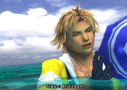 [The screen fades in on Tidus floating face down in some water. He wakes up, looking around] Tidus "Rikku!" [He gets hit in the head by a blitzball. He looks at the shore, where several people are gathered]