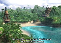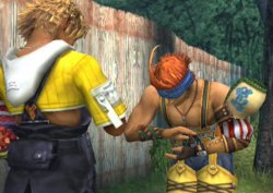 "It was just as Rikku said." "Wakka and Rikku couldn't both be lying. Why would they?" [Wakka laughs] Wakka "But you from the Zanarkand Abes--that was a good one!" "Hey, I'm not saying that team never existed, ya?" "But you gotta figure a team living in luxury like that'd be pretty soft, eh?" "I appreciated the fact that Wakka was trying to cheer me up." "But at that time, all I could think about was..." "everything that happened to me--all this--started with Sin." "Maybe if I could find Sin one more time, I could go home!" "For now, I'd just live life until that time came. No more worrying about where, or when, I was." "Sure it was hard not to think of home. But I started to feel better already." "A little better...maybe." [Tidus runs onto the next screen] Wakka "Hey! It's this way!" [Wakka runs; Tidus follows him. He eventually approaches Wakka, as the two of them stand over a ledge. Below the ledge is a large body of water. Tidus looks down at the water, while Wakka stealthily moves behind him] Tidus "Huh?" [Wakka pushes him with one arm. Tidus falls and goes "Waaah", landing with a splash. Wakka, in FMV form, dives into the water after Tidus] Tidus "What's the big idea?" [The two of them make their way through the water. At one part, Wakka goes up behind Tidus and gets him in a headlock] Tidus "Lemme go!" Wakka "Got a favor to ask ya." Tidus "You want me on your team, right?" [Wakka lets go; Tidus sinks, then surfaces again] Wakka "A major blitz tournament's coming up. All the teams in Spira'll be there!" "It's so huge, I'm sure someone there will recognize you!" "Then you can go back to your old team, right?" "It'll be fun! What do you say, huh? Come on, come on!" [Tidus solemnly floats, looking at the guy] Tidus "Sure thing." [He swims away] Wakka "Dude! Our team is gonna rock, eh?" [Wakka swims after him] "I thought then that blitzball and Sin were the only things that Spira and Zanarkand had in common." "I wasn't too far off, either." [Tidus, now on solid ground, walks to the edge of a cliff with Wakka. Below the cliff, in the distance, is a village] Wakka "This is where I was born. I started blitz when I was five." "I joined the Aurochs at thirteen...ten years ago." "Ten years...and we never won a game." "Well, after last year's tournament, I quit. Time seemed right." [Wakka walks off screen. Tidus' stomach growls, and he follows him] "So, after quitting, I got this new job, ya?" "But every time my mind wandered, I thought about the game." Tidus "Ten years without a single win'll do that." Wakka "My first match last year was my big chance." "But something else was on my mind. I couldn't focus." Tidus "Nice excuse." Wakka "Hey, hey!" Tidus "So you want to win the next tournament--go out with a bang." [Wakka nods] "So, what's our goal?" Wakka "I don't care how we do. Long as we play our best." "If we give it our all, I can walk away happy." Tidus "No, no, no, no, no. If I say "What's our goal?" you say "Victory!"" "When you play in a blitzball tournament, you play to win!" Wakka "Victory? You serious?" [Tidus nods. They make their way to Wakka's town, along the way, the encounter two people; the two who walked away from Wakka when Tidus and Wakka first met.] "Ah, the one from the sea!" "Be on guard. There're fiends on the road today!" "After surviving your run-in with Sin, 'twould be a shame if something happened now." Tidus "Who were they?" Wakka "Luzzu and Gatta--Crusaders." Tidus "Crews of what?" Wakka "What, you forgot that too?" [Tidus hangs his head] "Hey, sorry. Don't worry about it, I'll help you out." [Tidus lifts his head] Tidus "Cool." "In return, come tournament time, I'll make sure we take the cup!" Wakka "Cool." "About the Crusaders, you can ask them yourself. They've got a lodge in the village." [They reach the village, finally] Wakka "Besaid Village." Tidus "They got any food there?" Wakka [Points] "We'll get you something over there later. Take a look around first." "Let's see..." "The Crusaders lodge is over yonder. Luzzu and Gatta are usually there." [A shot of the Crusaders lodge, which is a large blue tent, is shown] "Oh, right." "Over here!" Tidus "Huh? What's up?" Wakka "You do remember the prayer, right?" [You get to choose between "I don't remember." or "I don't know any prayers."; for simplicity's sake, let's choose "I don't remember."] "I didn't know it in the first place, to tell the truth." Wakka "Man, that's like the basics of the basics. Alright, I'll show you." [He does the prayer; the hand gestrues that him and his Aurochs did to Tidus on the beach when they first met] "Go ahead, you try." [Tidus does it] "Hey, not bad." "Okay, now go present yourself to the temple summoner." "Any blitzball player would know that prayer. It was the blitzball sign for victory." [Tidus goes to the temple. Several people are inside, praying to statues. Tidus looks around] "It was then, standing in that place." "I began to realize how different this world was from my own." [Tidus approach a statue of a man, clad in a robe and holding a staff. A man approaches Tidus] "Ten years have passed since Lord Braska became high summoner." "And finally we received a statue for our temple." Tidus "What's a high summoner?" [Everyone gasps] "I...I got too close to Sin's, uh, toxin." "It was funny hearing myself make the same excuse over and over. Funny, and a little sad." "The summoners are practitioners of a sacred art, sworn to protect the people of Yevon." "Only a chosen few become summoners, who call forth entities of great power: the aeons." "The aeons hear our prayers and come down to us. They are the blessing of Yevon." "So what he meant..." "was that we should respect some kinda great man or something like that...I figured." [Tidus returns to Wakka's hut] Wakka "Sorry, man. No time for lunch yet." "Take a nap! You look bushed." [Tidus sleeps. The man from the temple who spoke to Tidus enters the hut. Wakka stands up.] "You could at least go see how they are doing." Wakka "We