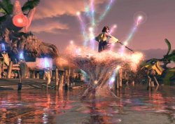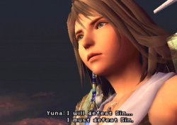 [Tidus approaches Yuna, who's surrounded by a group of people] "Word is that summoner's got noble blood!" "I heard she's Lord Braska's daughter!" "Ya don't say?" Tidus "Lord Braska's...daughter?" [Tidus goes to talk to Wakka] Tidus "So, is Yuna's father famous or something?" Wakka "She's the daughter of High Summoner Braska! You saw his statue at the temple." "Lord Braska defeated Sin ten years ago." "Yuna's the heir to a great legacy!" Tidus "It's tough when your father's famous." [Wakka goes "Huh?"] Lulu "Wakka's...a bit lacking in the imagination department." [Wakka goes "Huh?" again. Tidus giggles] Tidus "Thank, Lulu. I'll keep that in mind." [Everyone walks away from Yuna. Tidus walks up beside her. They're both at the front of the boat, looking out to sea. Tidus stretches] Yuna "The wind...it's nice." [Tidus goes "Mmhmm". Then, for no particular reason, they start giggling/laughing] "You're a blitzball player, aren't you? From Zanarkand, right?" Tidus "You hear that from Wakka?" "Wakka doesn't believe me at all." Yuna "But I believe you!" [Tidus mutters a "Huh?"] "I've heard in Zanarkand..." "there is a great stadium, all lit up even at night!" "Great blitzball tournaments are held there, and the stands are always full!" Tidus "How do you know that?" Yuna "A man named Jecht told me. He was my father's guardian." [Tidus looks surprised, then slightly pissed, and turns around, muttering "Jecht" in a low voice several times] Tidus "My father...his name is Jecht!" Yuna "Amazing!" [She does the prayer gesture] "You know, our meeting like this must be the blessing of Yevon!" Tidus "Sounds like him, but it can't be him." Yuna "Why not?" Tidus "My old man, he died. Ten years ago, off the coast of Zanarkand." [Yuna turns away] Yuna "I'm sorry." Tidus "He went out to sea for training one day...and never came back." "And no one's seen him since then." Yuna "Why, that's the day that Jecht came to Spira." "It's true! I first met Jecht ten years and three months ago!" "I remember, that was the day my father left." "The date fits, doesn't it?" [Tidus fumbles with his words] Tidus "Yeah, but how would he get here?" Yuna "You're here, are you not?" [They look at each other. Yuna smiles and giggles. Tidus smiles too. All of the sudden, the boat shakes and rumbles. Yuna falls down; Tidus grabs hold of her hand. The ship begins tilting to one side. Tidus and Yuna's grip fails; Yuna falls to the side of the ship. Kimahri jumps to there and holds her. The ship levels out] [FMV: a massive grey fin shoots out of the water] "Sin!" [Everyone gasps. The one who yelled "Sin!" positions himself behind a harpoon] Wakka "What do you think you're doing?" "Stick a harpoon in him and we'll all get dragged under!" "Sin is going for Kilika! We gotta distract it!" "Our families are in Kilika! Forgive us, Lady Summoner!" [Yuna nods] Wakka "Wait!" "Oh, boy..." [They fire the harpoon at the fin; another harpoon is fired. FMV: the two harpoons connect. The fin drags the boat along. A ton of water splashes onto the deck. Tidus looks around for a hand to grab. Tons of small pods from the fin are let loose onto the deck of the ship; they transform into bug things. A battle begins vs. the bug things, and a boss, Sin (which is really Sin's fin). Eventually, it gets defeated] [Sin tears out the harpoon device and swims away. All is silent in the boat. Wakka looks around frantically. He then dives into the water. Underwater, Tidus is floating without moving. Several fish attack him. Wakka throws his blitzball and the fish die. He then casts a spell on Tidus, who wakes up. He gives Tidus the thumbs up symbol. Before they can return to the boat, they got a boss battle to face: Sinspawn Echuilles. It gets defeated and blows up] [FMV: The quiet town of Kilika...a massive tidal wave approaches. Some kids are playing with a blitzball and see it, but it's too late. The entire city is engulfed in water. Everything begins to get sucked into the guy; houses, humans, everything. In the sky, a whirlwind of corpses and debris is formed, above Sin, who's floating on the surface. The FMV ends with a shot of the city, peaceful once more, with debris and a lone blitzball floating in the water...] "When Sin attacked Zanarkand that day, I woke up in Spira. "I kept hoping it would work in reverse, too." [Yuna looks outwards, sadly]