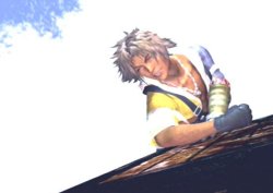 [Everyone's on board the boat heading for Kilika Port. Someone with a pair of binoculars is looking out at the city. Tidus goes up to her, does a series of somersaults and tumbles, and finally grabs it. He looks at the city, then Wakka, then Lulu, then Yuna and Kimahri. Yuna waves at him. The binocular girl grabs them back. He scratches the back of his head and giggles]