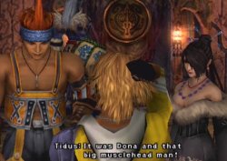 Tidus "It was Dona and that big musclehead man!" Lulu "Yuna will be the one to suffer the consequences!" Tidus "What consequences?" Wakka "She could be excommunicated!" [They wait for Yuna to be done] Wakka "Just wait." Tidus "So, what's in there anyway?" Wakka "The fayth, remember?" Tidus "Oh yeah, that thing. Right." Lulu "The fayth are people who gave their lives to battle Sin." "Yevon took their souls, willingly given from their still-living bodies." Tidus "Huh?" Lulu "Now they live forever, trapped in statues." "But when a summoner beckons, the souls of the fayth emerge once again." "That's what we call an aeon." Tidus "All that in this room?" "S-So what's Yuna doing in there?" Wakka "She prays with all her heart for a way to defeat Sin." [Yuna exits from the Chamber of the fayth and falls on her knees. Lulu and Wakka run to her side] "There was something I didn't tell anyone else that day." "That song we heard there, in the temple... I knew it from my childhood." "It was proof that Spira and Zanarkand were connected somehow. At least to me it was." "Maybe that's why, suddenly, I felt like...I just wanted to go home." "I tried to say something, to tell them. But the words wouldn't come." [They leave the temple; a group of people surround Yuna, and nod. The screen goes white, and fades back in on another Tidus flashback. In it, he's surrounded by people, who are clapping, waving, and cheering him on (though we don't hear it)] "I thought I had put my feelings for Zanarkand behind me." "But they were there, and they grew inside me, bigger and bigger, till I was just about ready to burst." [Scene returns to everyone leaving the temple. Tidus stops walking. Yuna approaches him] Yuna "Are...are you okay?" Tidus "I...I don't know." Yuna "What do you want to do?" Tidus "To scream real loud." [Yuna giggles. Tidus screams real loud. Everyone turns around. Scene ends; everyone leaves the temple, makes their way through the forest, and head to the boat in the Kilika Port] Wakka "Off to Luca at last!" "The matches start soon as we get there, so rest up on the way, ya?" [They get on board; the boat leaves]
