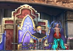 [A shot of people listening to the player's arrivals in a bar in Luca is shown] Jimma "Yes, Bobba. They're going to be pulling out all the stops to try and bring back the cup this year." Bobba "Exciting, isn't it, folks?" "Our next team off the ramp is..." [Screen fades to black, and fades back in on the Aurochs] "Well, well, well! If it isn't the Besaid Aurochs!" "They're a living, breathing, statistical impossibility! I've never seen a team this bad!" "That's right! In twenty-three years they've never made it past the first round!" "Only a few die-hard fans are in the audience today." Jimma "Best of lucky to them, and a safe journey back to Besaid." Bobba "Right, Jimma." "Moving right along, our next team is..." "Here they are, folks! Our very own Luca Goers!" [Screen shows the Luca Goers exiting the boat] "They've got power! They've got speed! They've got teamwork!" "They're an all-around first-class team! And they're back home in Luca!" Jimma "Without a doubt, they are the favorite this year, Bobba." "And after the way they dominated last year, it'd take a miracle for them to lose today." Bobba "You can say that again, Jimma. Look at the crowd, folks! Look at the crowd!" "Looks like all of Luca has turned out to cheer the Goers on!" "They know, I know, and you know, folks!" "The Luca Goers are number one!" [The screen shows the Aurochs. Tidus is annoyed] Wakka "It's like this every year, ya? Don't let it bother you." [Tidus grabs a megaphone and climbs onto a box] Tidus "Stop right there, Goers!" [The Goers, and the crowd, turn and stare at Tidus] "You guys are smilin' now, but not for long!" "'Cause this year, us Aurochs are taking the cup!" [Tidus laughs. The screen goes back. Scene change; he's back on the ground, as Yuna, Lulu, and Kimahri approach] Wakka "What in Yevon's name were you doing up there?" Datto "We sure stood out, though!" Letty "We were on the sphere!" Datto "We were?" [Three people run past the group] "Maester Mika is here!" "Already?" "The number 3 dock!" Tidus "What's up now?" Yuna "Maester Mika has arrived, that's what!" Tidus "Mika? Maester?" Lulu "Maester Mika is the leader of all the peoples of Spira." "He's come all the way from Bevelle. The tournament is being held to honor his fifty years as maester." Tidus "Fifty years? Shouldn't he be, uh, retired by now?" Wakka "Hey! Mind your mouth, now." Yuna "Let's all go see him!" [They run to meet Mika. Crowds of people are blocking their sight] Tidus "Can't see a thing!" Wakka "Shhhh!" [Loud joyous music is heard. Several people get off the boat; the first, a man with strange blue hair] "That's a Guado, right?" "Who could it be?" "Isn't that... Maester Seymour?" [Seymour faces the boat, bends down, and does the prayer gesture. Everyone in the crowd, except for Tidus, does it as well. Maester Mike gets off of the boat, stopping in front of Seymour] Mika "People of Spira, I thank you for your generous welcome." "Rise, Maester Seymour." "And all of you as well." "I present to you..." "the son of Maester Jyscal Guado, who departed for the Farplane a fortnight past." "As some of you already know, he has been officially ordained a maester of Yevon." Seymour "I am Seymour Guado. I am honored to receive the title of maester." "In life, my father Jyscal worked to foster friendship between man and Guado." "I vow to carry on his legacy, and to fulfill my duties as maester to the best of my abilities." [Wakka nudges Tidus] Wakka "You, too! Bow your head!" [Mike and his associates leave. Seymour stares at Yuna, before leaving] Wakka "Really psyches you up, ya?" "All right! Last meeting before the match! Hustle!" [Screen goes black: fades in on the Aurochs locker room. All of them are there, except for Tidus and Wakka. Tidus opens the door and walks in. They all go "Awwww" in unison, as a sign of dissapointment] Tidus "Where's Wakka?" Datto "At the match-up draws." Letty "We had to play the Goers in the first match last year." Jassu "The year before that, and the one before that, too!" Keepa "Well, we would've lost to anyone anyway." [Wakka walks in. They spring to their feet and face him] Datto "Cap'n Wakka!" Wakka "We're playin' the Al Bhed Psyches first. If we win, we're in the finals!" "That's right, we got seeded! Two wins and we're the champions!" [Everyone cheers] "First things first. Let's go over the basics again, boys." [Screen goes black. Blitzball tutorial. Screen fades back in on the locker room. Tidus yawns. The door opens: Yuna and Lulu enter] Yuna "There you are!" "Someone said they saw Sir Auron in a café!" Tidus "Au-Auron?" Yuna "Yes, Sir Auron! Let's go find him!" [Yuna walks back to the door; Tidus follows her. They're just about to leave when...] Wakka "Hey! Hey, hey, hey, hey, hey! The game starts like real soon!" "C-Come back quick, ya?" Tidus "Hey, I'll be back." Wakka "Yeah, okay." Tidus "Hey, Wakka." "You're stiff, man." "No, no, not your face." "Just breathe out, relax. Like this. Just breathe, yeah!" [Yuna giggles; Lulu shakes her head. Scene changes to outside the dressing room; Tidus is standing in front of Yuna and Kimahri] Yuna "Maybe now we can find Sir Jecht." Tidus "Huh? How?" Yuna "Sir Auron was also my father's guardian." "So, he might know where Sir Jecht is." "Let's go now!" [Yuna runs off; Kimahri soon follows] "It didn't even occur to me to thnk that the Auron Yuna was talking about..." "and the one that I knew from Zanarkand could be two different people." "I don't know why, but I knew it was the same guy. I knew it was the same Auron." [Tidus goes to run after her; he sees two Al Bhed Psyches along the way] "Y myto summoner!" "Fa sicd nabund." ("A lady summoner!") ("We must report.") Tidus "Hey!" "Al Bhed Psyches, right?" "Some Al Bhed saved me the other day, and..." "This girl Rikku gave me food and..." [Silence...] "Uh... You don't understand me, do you?" [More silence...] "Uh, anyway..." "If you meet Rikku, tell her thanks for me." "Oh, and as for the first game? May the best team