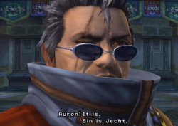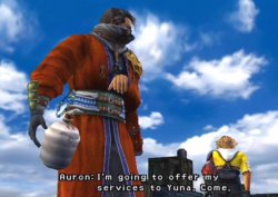 Wakka "Come on, look sharp!" [They stand upright] "The blitz season just started." "Don't make those faces, ya?" [He hands the statue to Datto] "Well... See you, boys!" "You be good." Aurochs [Non-enthusiastically] "Cap'n..." Wakka "I can't hear you!" Aurochs [Enthusiastically] "Cap'n!" [Screen changes: everyone's gathered in this one area of Luca] Yuna "Are you sure?" Wakka "Never liked long goodbyes anyways." "Sorry for making you wait, Yuna." "I had some promises to keep, ya." "From now on, I'm your full-time guardian." Yuna "Then welcome back, Sir Wakka." "Good to have you with us." Wakka "Hey, it's good to be back, ya?" "So, any news on what happened?" Lulu "Not really." "We don't know where the fiends came from." "Maester Mika is safe and sound, thanks to Maester Seymour." "That's about it." Yuna "Maester Seymour's aeon... It was so powerful." [Screen changes to Tidus confronting Auron] Tidus "Hey you! Don't just stand there! All of this is your fault!" "Gettin' swallowed by Sin! Ending up here in Spira!" "Not being able to go back to Zanarkand--everything, everything!" "I'm telling you, it's all your fault." [Auron laughs. All is silent for a few moments] Tidus "Who are you, anyway?" "You knew my old man, didn't you?" Auron "Yeah." Tidus "And you also knew Yuna's father?" Auron "That's correct." Tidus "Hey, man, no way!" "Hey man, there's no way. That's just impossible. Auron "Nothing impossible about it." "Jecht, Braska, and I... Together we defeated Sin, ten years ago." "Then I went to Zanarkand... "where I watched over you." "So that one day I could bring you to Spira." Tidus "Why did it have to be me?" Auron "Jecht asked me to." Tidus "Is he alive?" Auron "It depends on what you mean by "alive"." "He is no longer human." "But then..." "I felt something of Jecht there in that shell, couldn't you?" "You must have felt him when you came in contact with Sin." [The screen goes white, then comes back into focus on Tidus] Tidus "It can't be..." Auron "It is. Sin is Jecht." Tidus "No! That's ridiculous! No way!" "I don't believe you!" Auron "But it is the truth." "You'll see for yourself." "Come with me." Tidus "If I say no?" Auron "Every story must have an ending." Tidus "I don't care about your stories!" Auron "I see. Sorry you feel that way." "Fine, then. Come or don't come. It's your decision." Tidus "What am I supposed to say?" "You tell me it's my decision" "but I don't have a choice, do I?" "I have to go with you! I have to!" "You're the only one who can tell me what's going on anyway!" [Tidus crouches, visibly upset] Auron "Irritating, I know. Or are you afraid?" [He walks over to Tidus, and places his hand on his shoulder] "It's all right." Tidus "Auron?" "Will I ever go home? Back to Zanarkand?" Auron "That's up to Jecht." "I'm going to offer my services to Yuna. Come." [The screen changes to Yuna, Lulu, and Kimahri, waiting at the bottom of a series of stone steps] Wakka "Do you think he's gonna stay here?" Lulu "Sir Auron knows him, apparently. You were right. He did meet someone he knew." Yuna "Do you think he'll find a way back to Zanarakand?" Wakka "In any case, I'll miss having him around." Yuna "He's still in town, isn't he? I think I'll go see him..." "Oh!" [Auron walks on screen, with Tidus following behind him] Wakka "Whoa." Yuna "Sir Auron!" Auron "Yuna." Yuna "Sir?" Auron "I wish to become your guardian. Do you accept?" Lulu "You're serious?" Auron "You refuse?" Yuna "No, no!" "We accept! Right, everyone?" Wakka "O-Of course! No problem at all!" Lulu "But...why?" Auron "I promised Braska." Yuna "You promised my father?" "Thank you, Sir Auron! You're welcome to join us!" Auron "And...he comes too." [He grabs Tidus and flings Tidus in front of him] Tidus "Hi...guys. Eh...howdy!" Auron "This one I promised Jecht." Yuna "Is Sir Jecht alive?" Auron "Can't say. Haven't seen him in ten years." Yuna "I...see." Auron "You'll meet eventually." Yuna "Yes. I'm looking forward to it!" [He steps forward to meet Lulu] Auron "What's our itinerary?" "Where are we headed?" [The screen goes black] Yuna "Hey! Come with me!" [Screen fades in. Tidus approaches Yuna] Yuna "Hey, watch!" [She whistles] Tidus "Hey, you got pretty good." Yuna "You sound sad." Tidus "Yeah, maybe." Yuna "Wanna scream?" Tidus "I really don't think that's gonna help this time." Yuna "You know what?" "It's embarassing to say this myself..." "But summoners and their guardians are kind of like Spira's ray of light." "A lot of people in Spira depend on us." "I learned to practice smiling when I'm feeling sad, you know?" "I know it's hard." Tidus "Yeah... I undestand. I think." Yuna "Right, now let's see what you can do." Tidus "Huh?" Yuna "Come on!" [Tidus smiles, with a bunch of weird facial expressions] Tidus "This is werid!" Yuna "Next, try laughing out loud!" Tidus "What?" Yuna "Come on, show me!" [Tidus stretches, and forces a loud, obnoxious, annoying laugh. Everyone stares at him] Yuna "You probably shouldn't laugh any more." [He keeps laughing. Yuna joins in. Then they start normally laughing] Yuna "Too funny!" Tidus "It was your idea!" Yuna "Um...thank you." "I want my journey to be full of laughter." Tidus "Okay." Yuna "If we should get seperated, just whistle." "I'll come running, I promise." [Tidus nods, along with a "hm"] Tidus "Well, let's go." [Tidus turns around. Everyone's staring at them] Tidus "What're you looking at?" Wakka "We were just worried you guys might've gone crazy!" Tidus "Sorry!" Yuna "Well then, alright." "Now, we will go to the temple of Djose." "And guardians? Don't forget to smile." [Tidus runs up the stone steps, stretches, and looks ahead. In front of him is the winding dirt path which leads to the Djose temple; Mi'ihen Highroad. While he's walking along, a short, old, white-bearded man, with a tall green hat and green outfit stops him] "Do you know what those ruins are from?" Tidus "Some old city?" [Yuna walks on screen] "Correct. A city most ancient!" "A terrible testament to