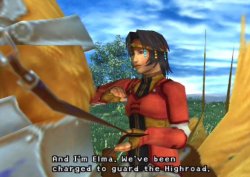 Lucil "Good. We should get back to our rounds. Farewell." Elma "Our prayers are with you." [They ride away] Tidus "A large fiend..." "Let's go get him!" Auron "Why?" Tidus "It's the right thing to do." Auron "It's the right thing to do?" [Auron softly laughs to himself] Tidus "What'd I say now?" Auron "Jecht said that a lot, too." "And every time he said it, it meant trouble for Braska and me." [They continue along the Mi'ihen Highroad. The come across a woman and a young child] "My Lady Summoner!" "You're a summoner?" Yuna "Yes. My name is Yuna." "I'm Calli." Yuna "Nice to meet you, Calli." Calli "Lady Yuna, are you going to bring us the Calm?" Yuna "Yes, very soon." Calli "Yay!" [She starts to run circles around Yuna] "We're looking forward to another Calm, My Lady Summoner." Yuna "I'll do my best." [She looks to the others] "And good luck to your guardians as well." [Scene change. Calli waves to the group, then walks off-screen along with the lady] Tidus "What's the calm?" Lulu "The Calm is a time of peace." "It comes after a summoner defeats Sin, and lasts until Sin reappears." Yuna "Sin dies and is reborn." Tidus "I get it!" "I thought it was weird." "Yuna's dad defeated Sin ten years ago, right?" "But Sin's still here! Didn't make much sense till now." "Wait... If it just comes back..." Yuna "Don't say it isn't worth it... Because it is." [Screen fades to black] "Even for a little while..." "people can sleep in their beds without being afraid." "That kind of time is worth anything." "Don't say it isn't worth it." "Your words that day, Yuna--I remember them well." [They continue along the Highroad. They encounter a chocobo carring a caravan of some sort. Luzzu and Gatta are there as well, leading the caravan forward. The group heads forward and reaches them] Gatta "Hey!" "Hey, we saw the game! You guys were great!" Luzzu "Congratulations, Wakka!" [Elma and Lucil ride on-screen] Elma "Hey! Stop loafing around!" Gatta "Uh... The lady summoner and her guardians..." Lucil "This mission requires our full attention. We've no time to waste!" "Understood?" Luzzu "Yes, ma'am! Apologies, ma'am!" Lucil "Carry on." [Elma and Lucil ride off. Luzzu turns to Gatta] Luzzu "See? Keep your head down, say "sir" a lot, and you'll do fine." Gatta "Right...sir." [Yuna giggles] Luzzu "Hey, Yuna." "Even though Yevon rejected us..." "we still believe in you. That won't ever change." Yuna "Thank you, Sir Luzzu, Sir Gatta." "But, you know... It's not too late for you to go back to Besaid, and..." Gatta "We should be going, sir!" [They run after the caravan, which was moving forward. The group continues along the Mi'ihen Highroad. They encounter two people in an argument: one, a Crusader, and another, a girl dressed in green robes, with a timid, gentle voice] "We'll defeat Sin any way we can!" "But Yevon's teachings say..." "Enough!" [He walks away] "I-I only meant to..." Yuna "Are you all right?" "Lady Summoner...?" [They do the prayer gesture to each other] Yuna "Yes, I am Yuna." "It is an honor, my lady." "My name is Shelinda. I am a disciple of Yevon." Wakka "What was all that about? The Crusaders' operation?" Tidus "You mean the one Gatta and Luzzu were talking about?" Shelinda "I heard they were to use forbidden machina! I had to stop them." Tidus "Huh? Why?" Lulu "The use of machina is strictly forbidden by the Yevon priesthood." Wakka "That's bad, ya?" Auron "Let them use whatever they want." "They still won't defeat Sin." Shelinda "But, it's not about defeating Sin!" "The teachings of Yevon must be upheld!" Wakka "Yeah! Right!" Shelinda "But you don't understand! The Crusaders won't even listen to me." "And it's all because I'm just a lowly acolyte." Yuna "Don't say that." "Well, I haven't been a summoner for very long myself, you see." "Still, I can't put myself down every time I fail." "People are depending on me. They're depending on both of us!" Shelinda "Yes! Yes, you're right, my lady. Absolutely right!" "Thank you so much, Lady Yuna!" "Now, I feel I have the courage to finish my training." [She leaves, as does the group. They eventually reach a building] Auron "We rest here." Wakka "But, this is an Al Bhed shop!" Auron "Is that a problem?" Wakka "They don't believe in Yevon, and in Luca they..." "They kidnapped Yuna!" Auron "Where were her guardians?" [Wakka and Lulu place their hands to their foreheads] Yuna "Sir Auron's just concerned about your health." Wakka "I'm not tired one bit!" Auron "Well I am." [He walks into the building; they follow him. The screen goes black as they sleep. Screen fades back in inside the building, known as Rin's Travel Agency] Tidus "As if I could sleep!" [Tidus exits the building. The sun is setting] Tidus "Check it out!" "That sunset was different from the one I saw in Kilika. It was quiet---almost gentle." [He sees Yuna sitting, alone. He walks and approaches her] Tidus "Whatcha up to?" [There's a twinge of panic in her voice. She turns around and smiles. He sits down beside her] Yuna "Pretty..." Tidus "Sure is." Yuna "I wish I could live in a place like this." "Peaceful... Living with a smile on my face every day." Tidus "You can, once you beat Sin, right?" Yuna "But then a new Sin will be born anyway." Tidus "Well then, you can just beat it again." Yuna "I wish I could." Tidus "Hey, you can! Trust me! You are the best summoner out there!" "Yuna, why does Sin always come back?" Yuna "Sin is our punishment for our vanity." "And it will not go away until we've atoned." Tidus "How do we do that?" "What did we do that was so bad in the first place?" "Was it using lots of machina or something? Oh... Wait, was that such a bad thing, really?" Yuna "It's funny..." "Ever since I was young, I never questioned it." "But now that you ask me if it is that bad or not...I don't know." "There are so many things I don't know." Tidus "Well then, we're the same!" [Tidus immitates an old man's voice] "Such thinking is very unbecoming of a summoner!" "Sound like Mika?" [Yuna laugh