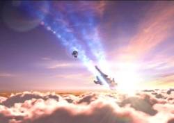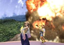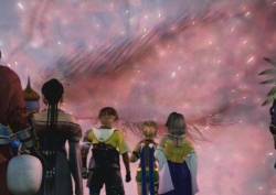 [Everyone on the airship stands up. All is silent. Rikku looks at the path of the energy ball, carved into the ground, ocean, and clouds. Suddenly, another blast returns their way! The blast approaches the airship, as the group starts to run back into it, but too late; a big fiery explosion is seen. From space, we see six seperate orangish lines converging on one point...]