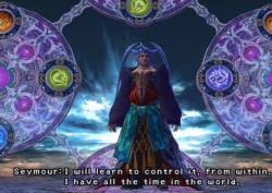 "I will learn to control it, from within. I have all the time in the world." "Since you were gracious enough to dispose of Yunalesca..." [He begins to transform, as his voice sounds more metallic] "the only means of destroying Sin is forever gone." "Now nothing can stop us!" Tidus "Well, we can!" Seymour "By all means, try!" "You should thank me. Your death means your father's life!" [Boss Battle vs. Seymour Omnis. Your team.....DIES! Okay, just kidding. Seymour loses for a fourth and final time. Poor guy. The scene changes to Seymour, back in human form, as he stumbles backwards and falls to his knees] Seymour "No!" Wakka "Now! Yuna, send him!" Yuna "Right!" [She steps forward and begins to send him] Seymour "So it is you, after all, who will send me." "But even after I am gone, Spira's sorrow will prevail." [A bright beam of light appears on him, and he gets sent. Dozens upon dozens of pyreflies depart and fly upwards from where his body once was] Tidus "Sin will be right behind you." [They travel through the next series of screens, known as the "City of Dying Dreams", which is, well, actually a sort of mechanical city. Lots of metallic buildings and structures. On to another screen, called "Tower of the Dead"; Tidus walks down a long path, and suddenly, from high above, a huge....thing comes down, smashing into the ground. Tidus narrowly avoids getting squished by it. This thing is, more than likely, the Tower of the Dead. Tidus approaches it and looks up. It's a huge mechanical construct, with multiple icons with a strange symbol; the symbol of Yu Yevon. At the base of it is the same symbol; approaching it makes the screen go white. The screen fades in on some....strange area, with crystals that shoot out of the ground. Take not: the screen where we see Luzzu and the other dead people after Operation Mi'ihen is THIS exact same screen. What this means can only be theorized, really. Anyways, scattered throughout the room, appearing at random, are 10 special treasures. After collecting all ten, Tidus gets sucked up into the sky. The screen goes white]