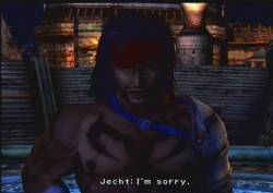 [They arrive in the weird Zanarkand-like area where Tidus went to after being sucked into Sin at the start of the game. Above them is a sky filled with stars. Tidus stares ahead; Jecht (though we don't see his face) crosses his arms. The group approaches him. Auron steps forward. Tidus stares. Jecht's back is turned to them] Jecht "You're late, Auron." Auron "I know." [Jecht turns around] Jecht "Hey." Tidus "Hi." Jecht "Hah! You got tall, but you're all bones!" "You eating right, boy?" [Tidus is silent. Rikku looks at him] "You've really grown." Tidus "Yeah, but you're still bigger." Jecht "Well, I am Sin, you know." Tidus "That's not funny." [Jecht laughs] Jecht "Well, then... I mean...you know." "Let's end this." Tidus "Dad? Jecht "Yeah?" [Tidus holds back the tears] Tidus "I hate you." Jecht "I know, I know." "You know what you have to do." Tidus "Yeah."