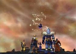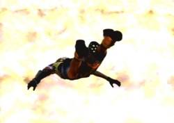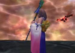 [The blob slams into the sword. Red energy flies everywhere. The screen goes white: it fades in on....somewhere....the group is sitting down on the sword, which is floating in mid-air. All around them is red. Tidus, lying down, gets up. Yuna is standing up, staring at the huge malevolent redish-black blob, which flies away. Yuna turns around]