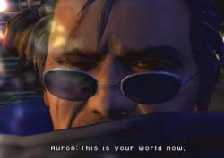"Everyone!" "This is the last time we fight together, okay?" Wakka "Huh?" [Tidus steps foward to face Yuna] Tidus "What I'm trying to say is..." "after we beat Yu Yevon, I'll disappear!" Lulu "What are you talking about?" [Tidus looks at Yuna. She pouts. He walks past her to Yu Yevon, takes out his sword, and assumes a battle stance] Tidus "I'm saying goodbye!" Rikku "Not now!" Tidus "I know it's selfish..." "but this is my story!" [FINAL BATTLE! Once Yu Yevon is defeated, the bug thing rises into the air, surrounded by rings of energy, and dies in dramatic final boss fashion. The Yu Pagodas get destroyed too. The screen goes white, and fades back in on Besaid; it's nighttime there, and the fire in the middle of the village is burning brightly. Many people are gathered around it, including the Aurochs, who are staring up into the sky. Everyone looks up, claps and cheers. We see that Gatta is also there, looking up, as well as the three Chocobo Knights! The camera focuses on Gatta. He does a Crusader salute upwards, as do some Crusaders behind him, and the Chocobo Knights. The camera moves to the entrance of the temple, where Maechen is standing; past a priest, who does the prayer gesture; and into the temple itself. Inside the Chamber of the Fayth, the stone statue of the Fayth begins to drain and fade away, just leaving an object of stone. The same happens to the Fayth statue in Macalania, then Kilika. In Bevelle, the floating Fayth vanishes] [Back to the imaginary Zanarkand screen; everyone is standing there, as Yuna dances and performs the sending. She turns around, and is shocked; some pyreflies are exiting Auron's body] Auron "Don't stop." Yuna "But I..." Auron "It's all right." [The camera angle shifts itself so we see things from Auron's eyes. He looks at Wakka, then steps foward, and looks at Kimahri. He gives him a friendly hit on the chest. He looks at Lulu, then Rikku, and finally, Tidus. The camera angle changes, and we see Auron walk up to Tidus] Auron "It's been long enough." [He walks forward to Yuna, as pyreflies continue to rise from his body. We see he's standing at the edge of the platform, as everyone, including Yuna, looks at him. He holds his sword, and looks back at them] Auron "This is your world now."
