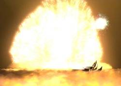 [FMV: Yuna continues the sending, on the airship. In the background, the Aeons are floating around, and Sin falls down, exploding in a MASSIVE blanket of yellowish energy that spans a huge distance. The Airship floats above the cloud of yellow. We see the Aeons, floating around, get sent. Sin's fin explodes in a huge burst of energy as well. On Mount Gagazet, the fayths turns to stone, and the pillar of blue energy turns into a ball of water, then vanishes into many water bubbles. In the bubbles, we see images of the people of the dreamworld; Tidus is one of them. Back on the airship, Tidus looks at himself, as he begins to fade. Yuna shakes her head]