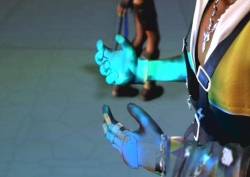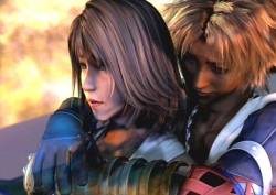 [Tidus turns and faces her back, a sad look on his face. Yuna faces forward solemnly. He walks up to her from behind and wraps his partially-fading arms around her. He fades through her body, walking forward. We see a final shot of the group; Kimahri and Lulu are showing little to no emotion, though Lulu does do a small wave. Yuna's still staring forward. Rikku is jumping and waving. Wakka looks sad and dejected, almost like he said/did something wrong. Tidus, burying his anguish, turns around and sprints to the edge of the airship, and jumps off. He floats down through the clouds, and vanishes...we see Braska, Auron, and Jecht. Jecht sticks out his hand; Tidus slaps it] [Scene change; on a dock in Luca (presumably) looking out to sea. Yuna whistles. She breathes, and whistles again. Lulu walks up the dock] Lulu "Yuna, it's time."