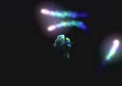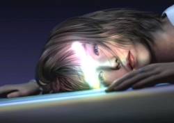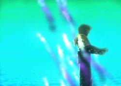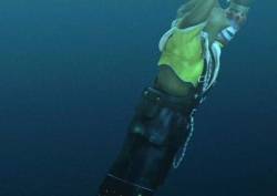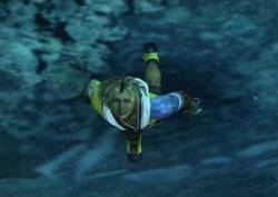 [One of the pyreflies floats by him. He lifts his head and looks at it. He uncrouches and stretches; the blackness has now turned to dark blue, and we see he's underwater. He turns his head upwards and swims to the surface. The camera angle changes so we see Tidus, smiling and content, gleefully swimming up to the surface. Just before he reaches the screen (presumably, the surface), the screen starts to go white, and then goes completely white; the words "Final Fantasy X", along with the FFX Symbol, are shown on the white screen. The screen fades to black, and the words "The End" appear in white]