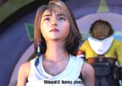 [Yuna runs to Tidus and passes through him. Everyone gasps. He looks at his hands; pyreflies fly up from his body. Yuna, lying down, watches a pyrefly fly up in front of her face. They go into the air. Yuna stands up; their backs are facing each other] Yuna "I love you."