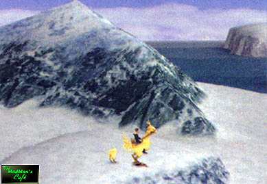 Squall riding a Chocobo on the World Map - The traditional form of transport is still present. Note: the smaller chocobo nearby; could this be the Guardian Force chocobo?..